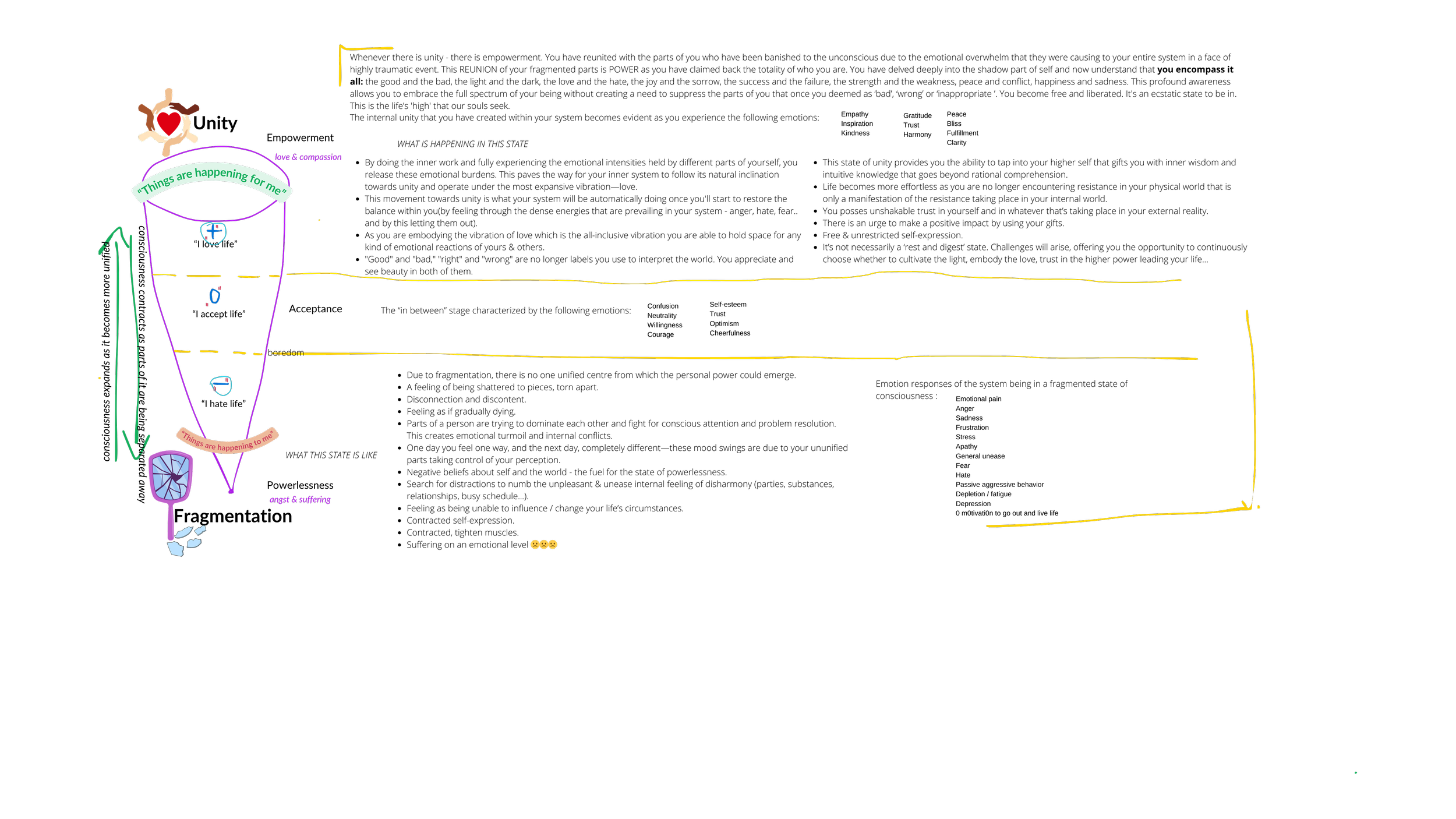 On the contrary, your state of consciousness can shift toward the unified side of the energetic spectrum, reflecting an integrated and healthy psyché. In this state, your inner parts are aware of each other, coexist in balance rather than seeking dominance, and are free from the internal conflicts that create emotional turmoil and burdens that deplete energy from you.